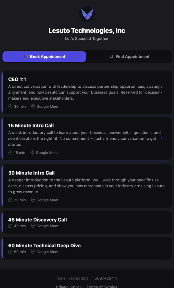 Most scheduling tools are standalone apps. Lesuto Connect is built into your commerce platform — so your booking page, storefront, outreach campaigns, and CRM all share the same brain. A client who books a demo can browse your products on the same page. A lead from an outreach campaign can schedule a call in one click.